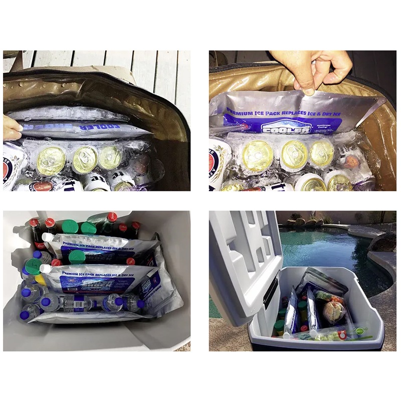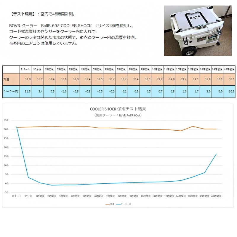 氷は速く温度が上がり、0℃になってやがて溶けていきますが、Cooler Shockは-7.8℃をキープするように作られているため、クーラーボックス内の保冷効果も長時間キープできます。