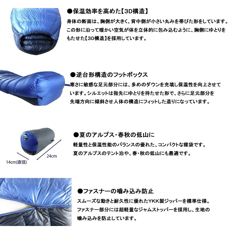 夏の涸沢や槍ヶ岳、剱岳などでのテント泊には最適の保温性を持っています。