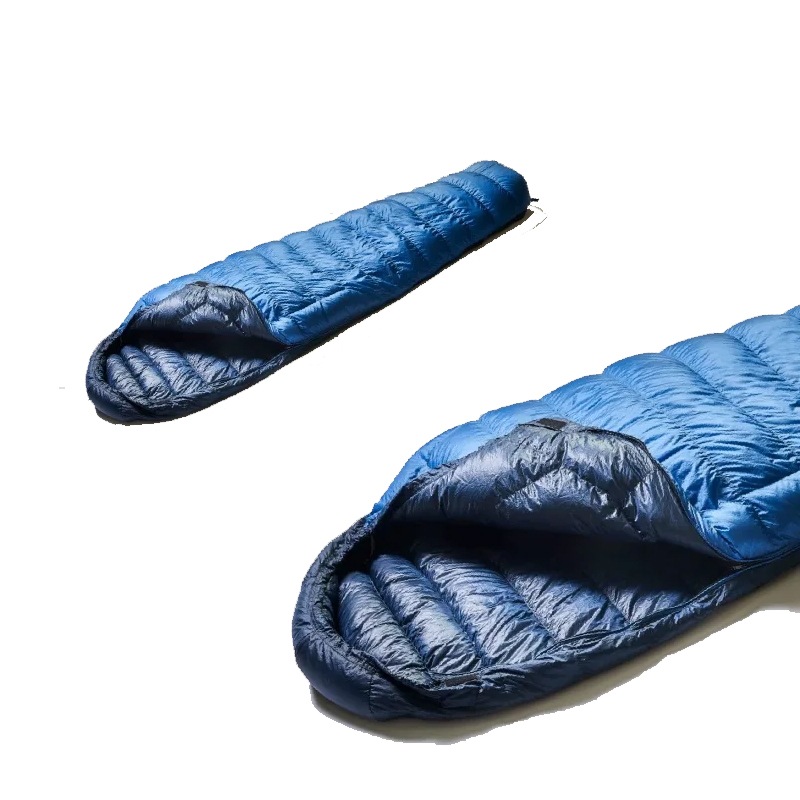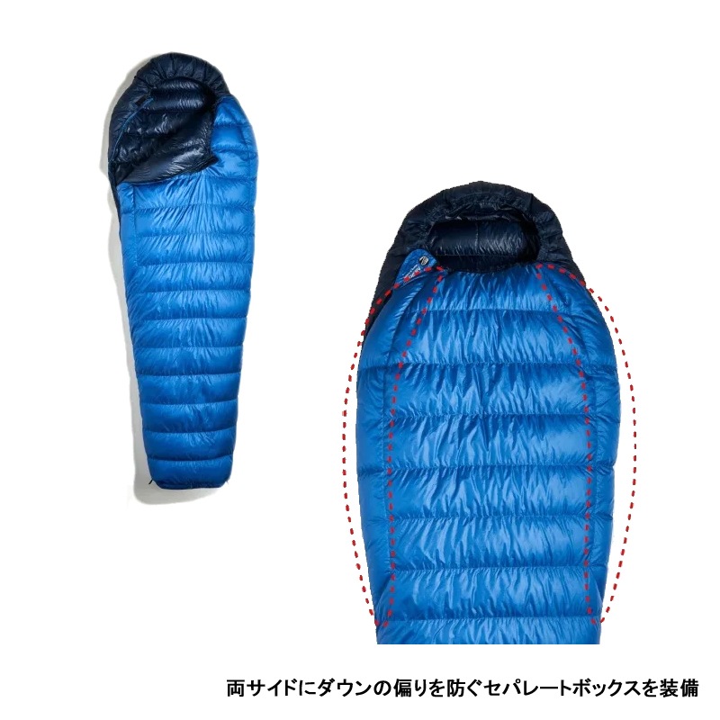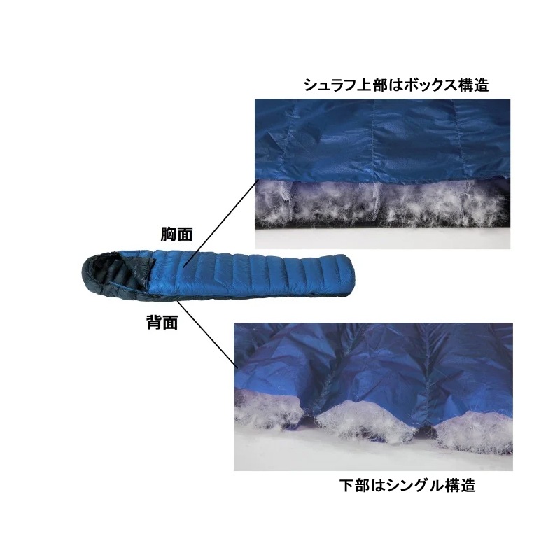 保温性と軽量性の両立のために、シュラフ上部はボックス構造、下部はシングル構造で仕上げています。