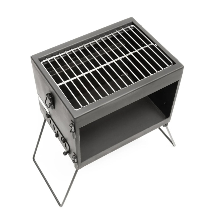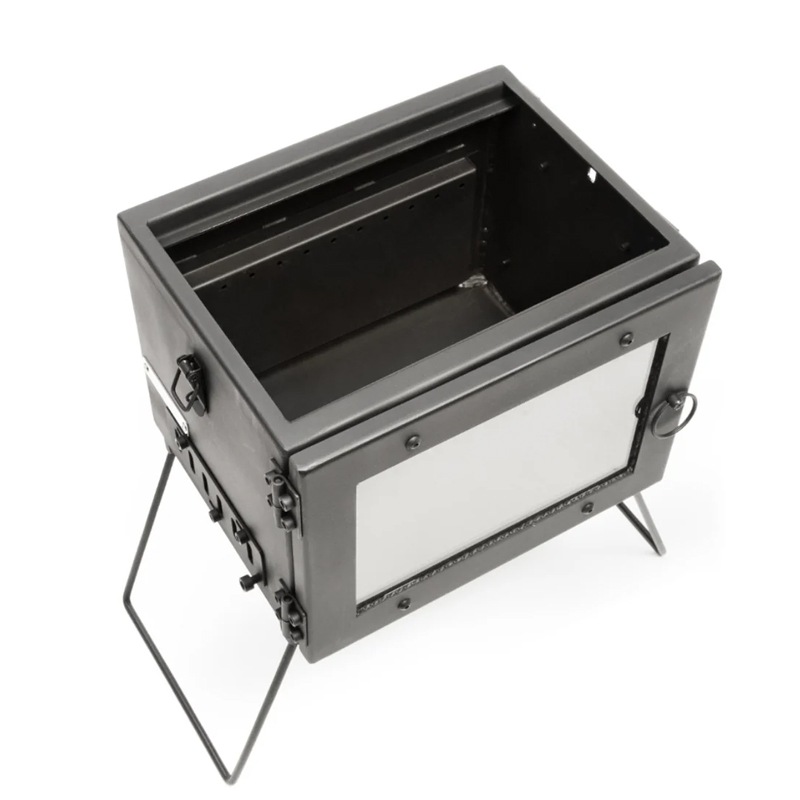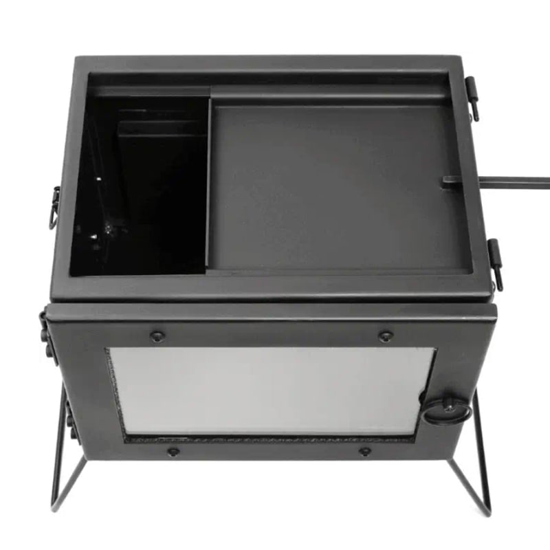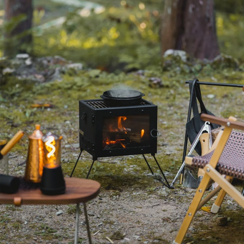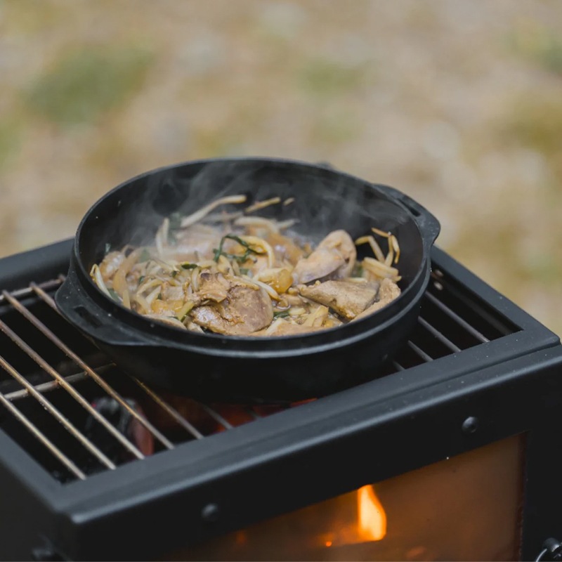 天板での調理はもちろん、天板を外せば二次燃焼構造の焚き火台に早変わり。付属の焼き網を使えばグリル調理も楽しめます(※炭は使用不可)。火の状態が見やすく、吸気口や扉から火力調整がしやすいため、料理のしやすさも抜群です。