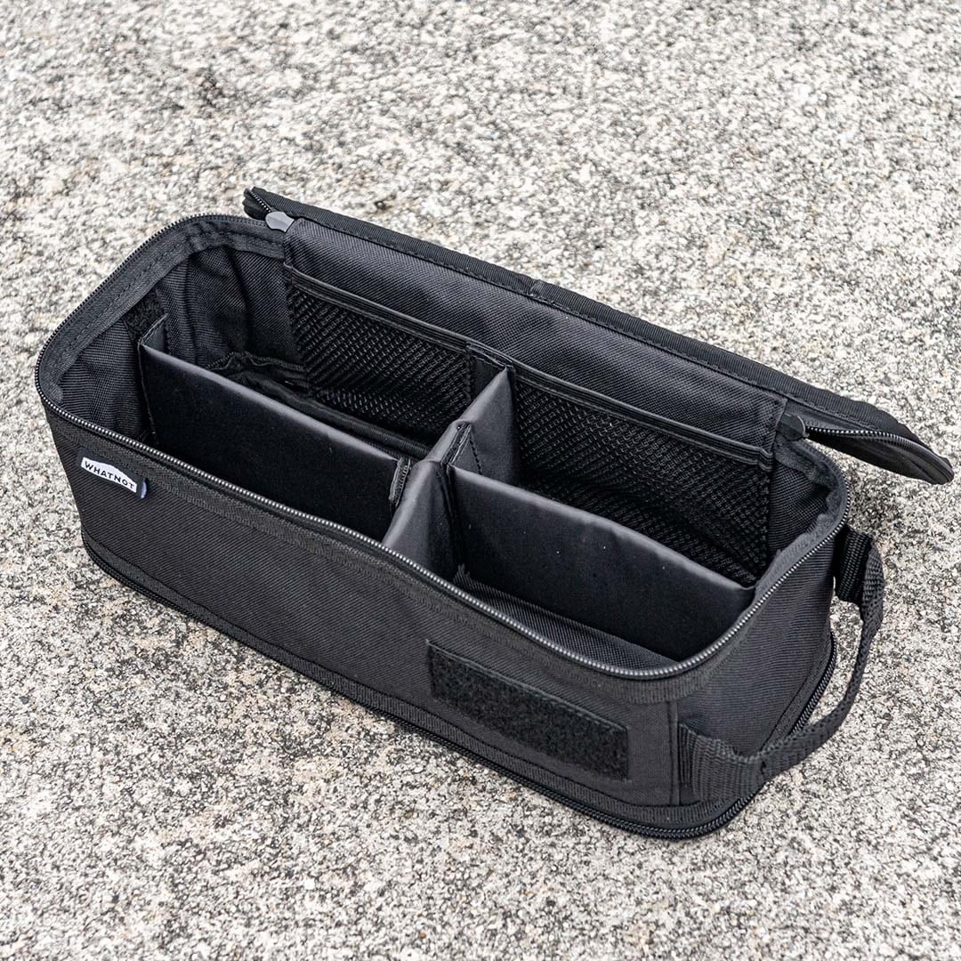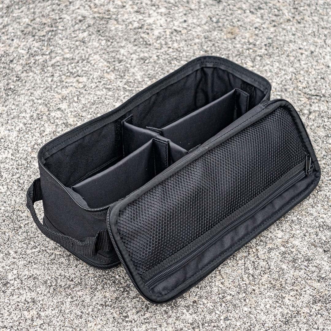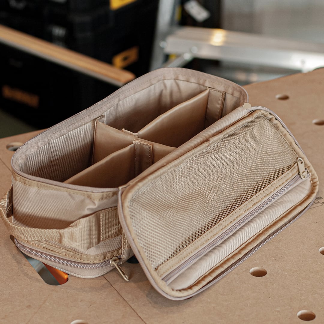 内側にメッシュポケット、マジックテープで着脱可能な仕切りによる自在な収納。