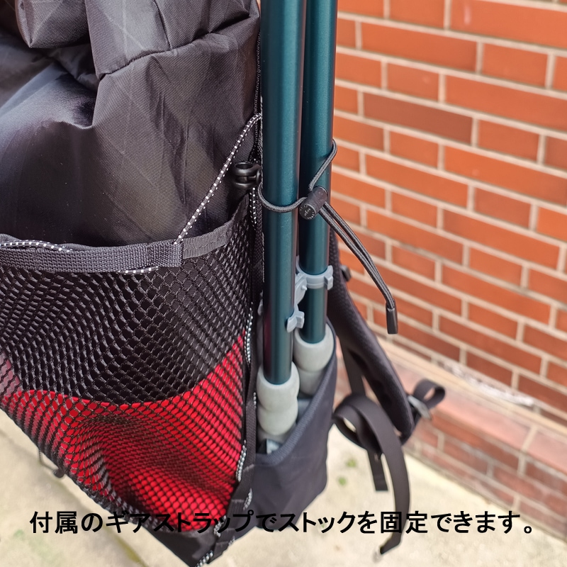 サイドポケットはストレッチメッシュ素材で、600mlのペットボトルやストックを入れることが出来ます。