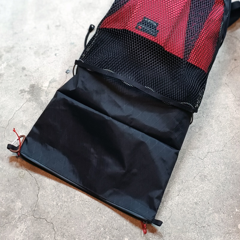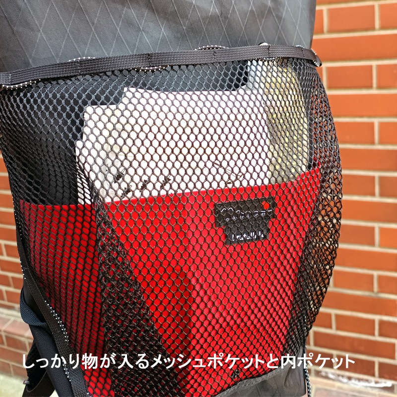 スリムな形状の本体に大きなメッシュポケットとサブポケットが付き、サイドポケットとしてストレッチメッシュを配置しました。