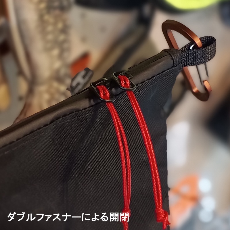 フロントポケットの周りには、φ3mmのバンジーコードがデイジーチェーンに巻き付けてあり、コードにテンションを掛けることでポケットの垂みを調整することができます。