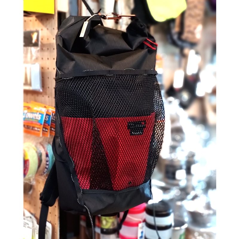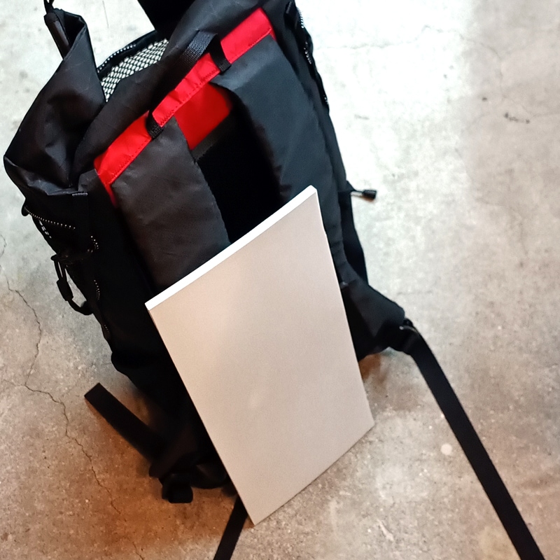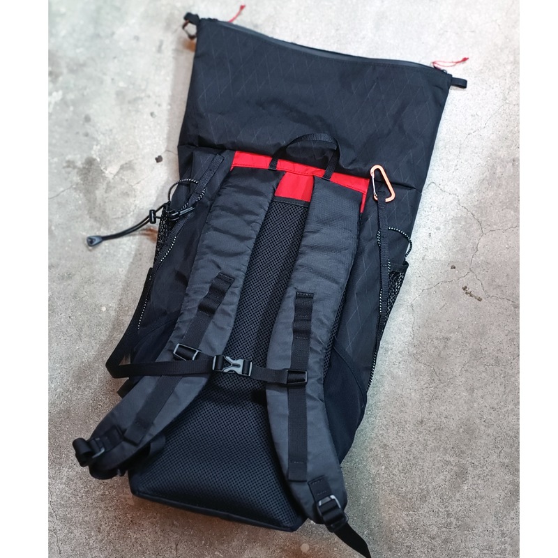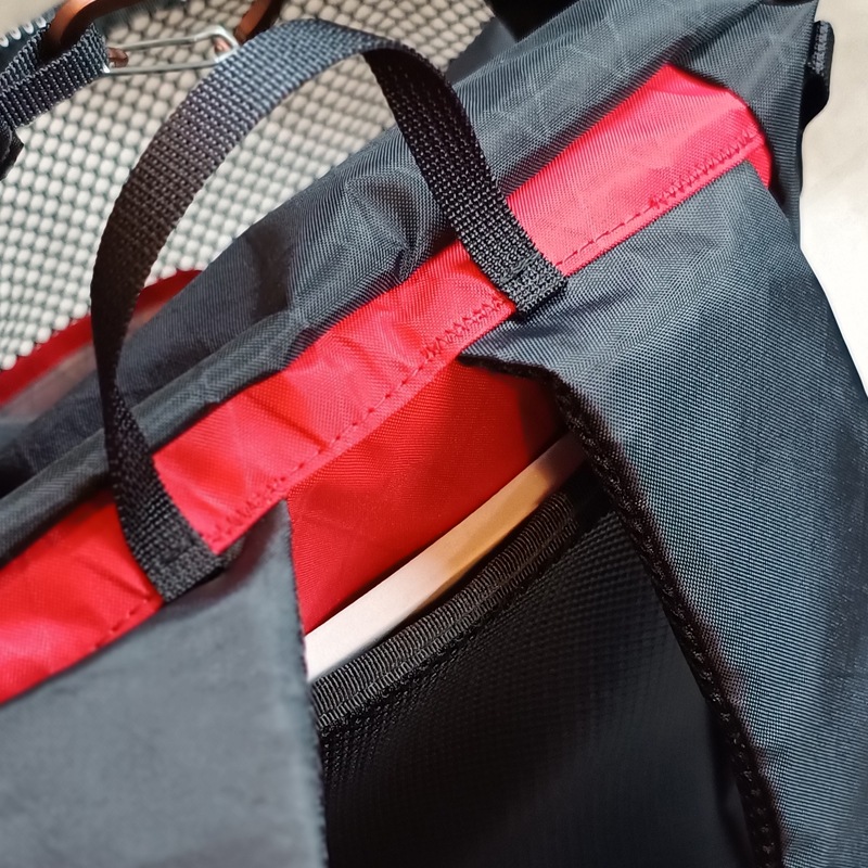 左右のループをカラビナでデイジーチェーンに引っかけることで、上部が雨蓋のようになって、少ない荷物でも形をキープしてくれます。