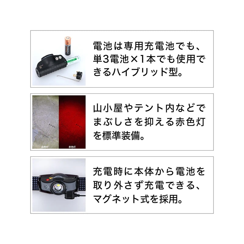 アドバンスフォーカスによるフラットでクリアな配光は、夜間の活動における安全性を向上させてくれます。また、付属の専用充電池でも、市販のアルカリ単3形電池1本でも使用できる、アウトドア用ハイエンドモデルです。