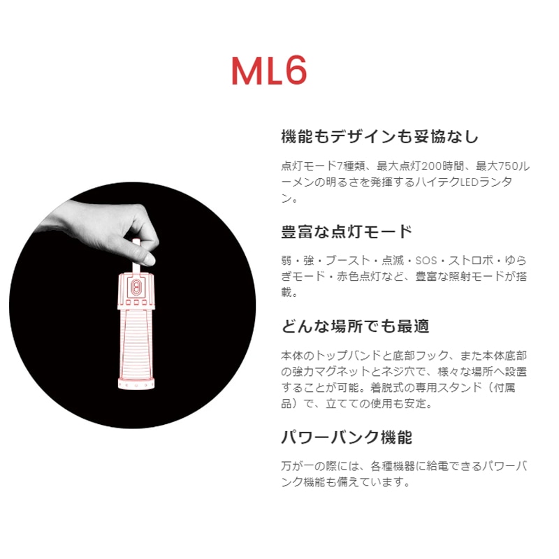 キャンプや登山、釣りで活躍するML6ランタンは、コンパクトな見た目ながら最大750lmの明るさを発揮します。