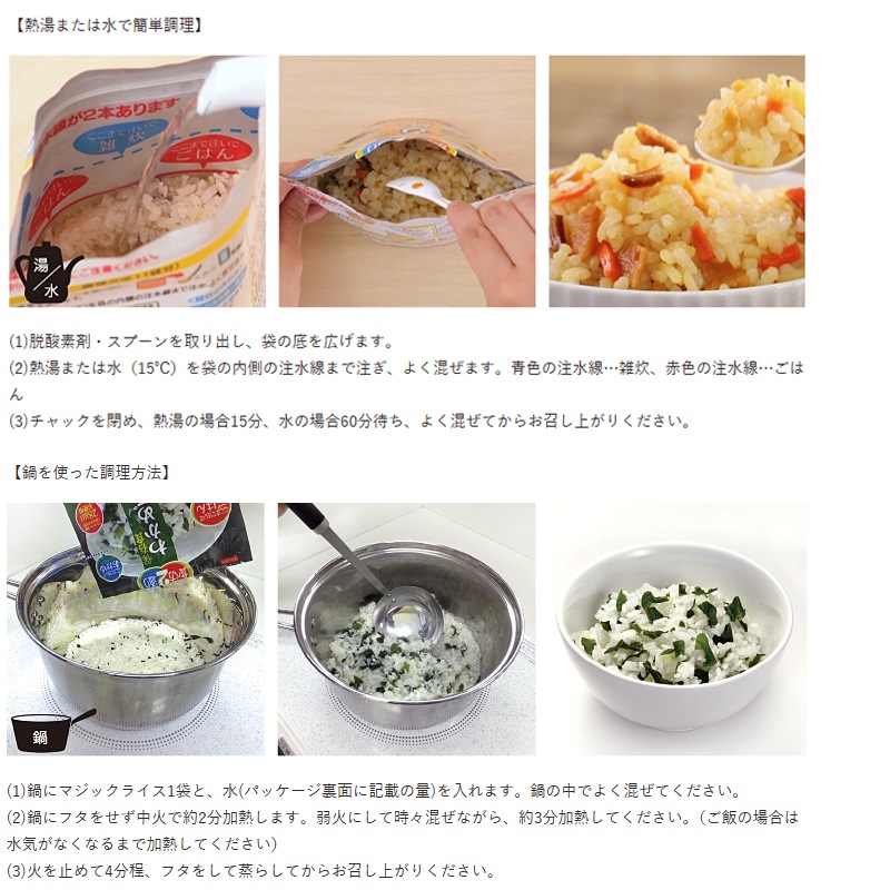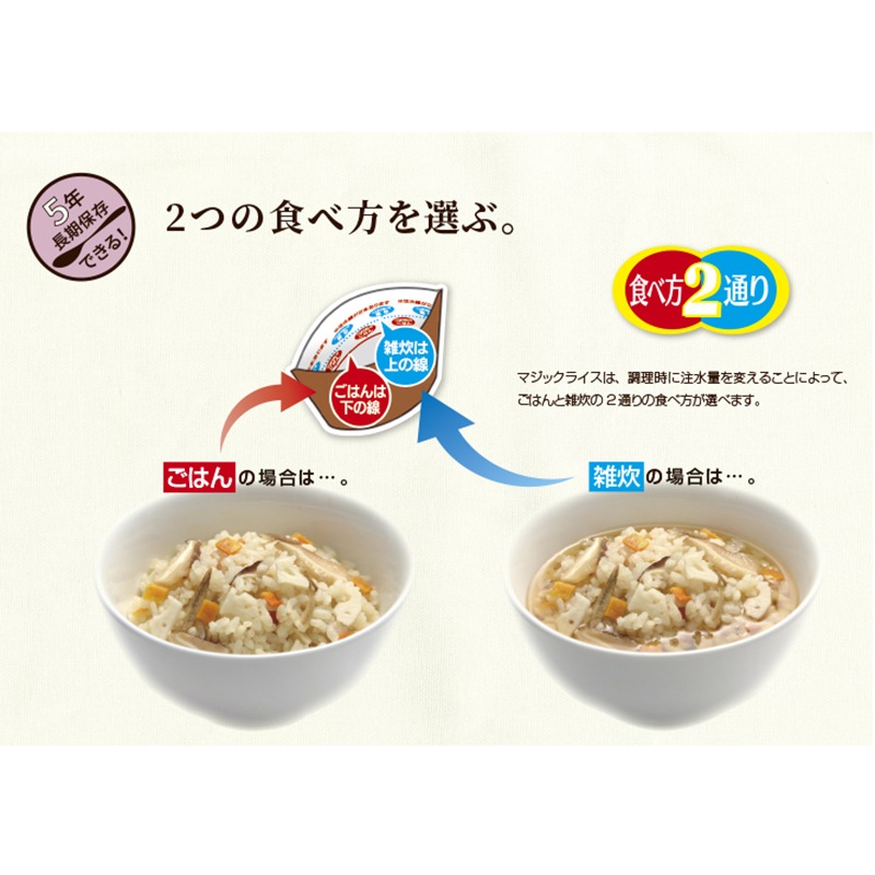 ◇マジックライスはアルファ化米です。ご飯を一度炊飯し、乾燥させたお米で、軽量で
