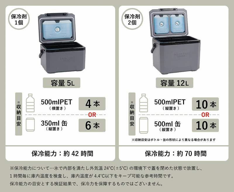 また、12Lサイズには別売りの「THE ICE ERA COLD ICE BRICK」に6缶セットした状態での収納が可能です。(※冷蔵保存されていた缶と一緒に「THE ICE ERA COLD ICE BRICK」を使用すると中身が凍結する場合があります。)