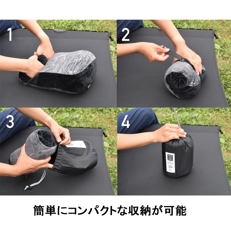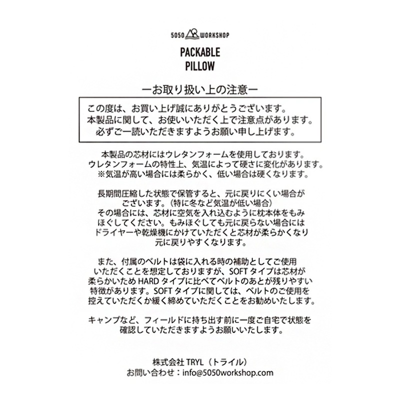 5050WORKSHOPのPACKABLE PILLOWは低反発で頭に馴染むように沈むのでずれにくく、アウトドアでもスッキリした目覚めを体感いただける枕です。