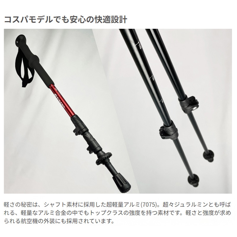 SINANOトレッキングポールのベーシックモデルです。お求めやすい価格でも、材質は超軽量アルミ、ロック機構はレバーロックを採用した高機能トレッキングポール。