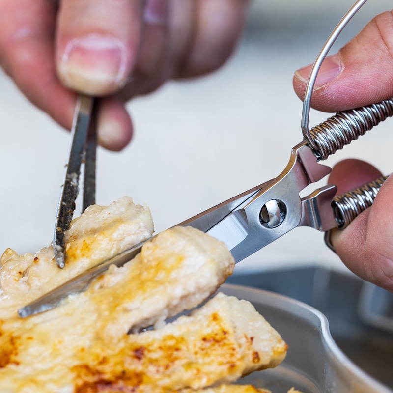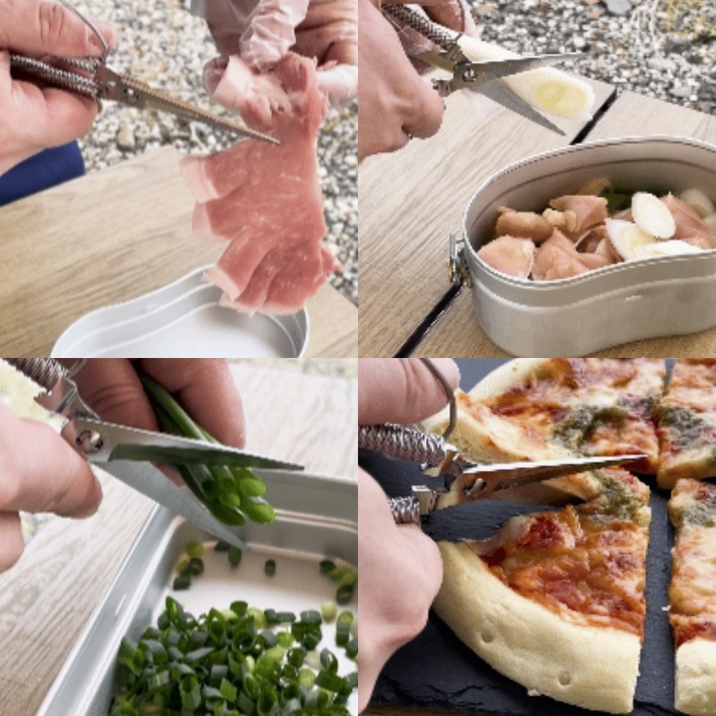 生肉を切る際はまな板いらず、葉物野菜はクッカーやフライパンの上で直接切って入れることが出来るので、洗い物を少なくしたいキャンプにて鋏は非常に活躍いたします。