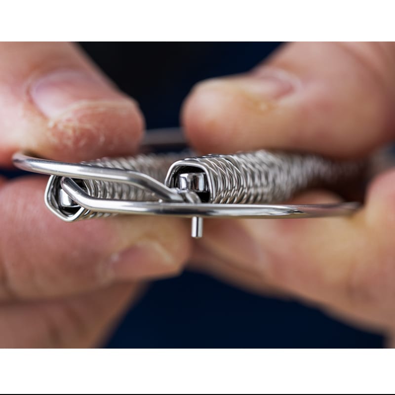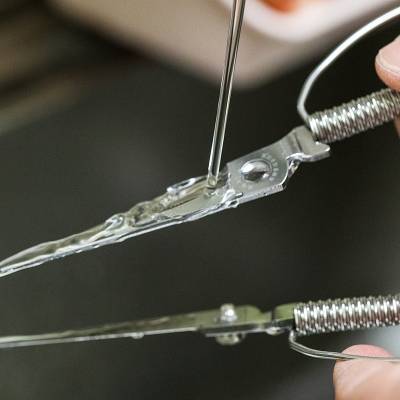 この線材はある一定の形状を規則的にずらしながら、らせん状に巻き上げられているため柄に凹凸ができ、更にバネ性も保持しています。そのためハサミを握った際にグリップ性が良く、滑りにくい持ち手となりました。