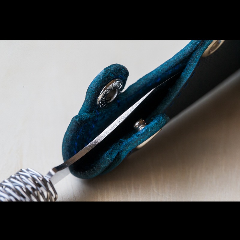専用シース: 藍色の牛革製シースはボタン式で、ナイフの出し入れがしやすい形状になっています。