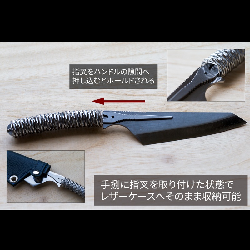 オプションとして用意されている「指叉(ピックフォーク)」は、ナイフのハンドルの隙間に収納でき、ナイフと一緒にシースに収めることができます。食材を押さえる際にも便利です。