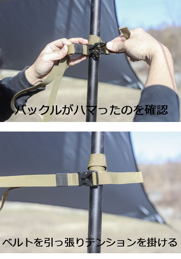 2. バックルがはまるまでポールに巻き付けます。この時、バックルがしっかりハマったことをご