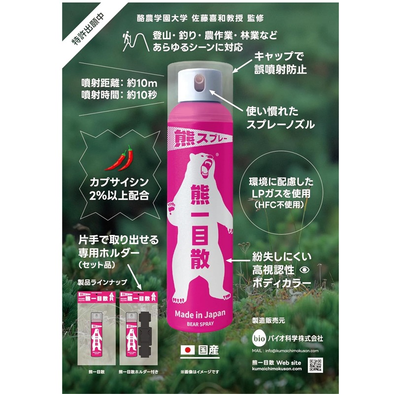 動物医薬品メーカー・バイオ科学(本社:徳島県)が、熊研究の第一人者・酪農学園大学の佐藤喜和教授と共同で研究開発を行い、現在、特許出願中の新商品。高品質かつ信頼性の高い国内製造により、安全性と実用性を兼ね備えた熊撃退スプレーです。