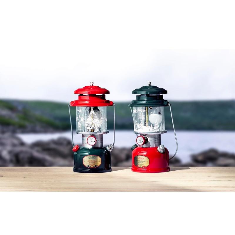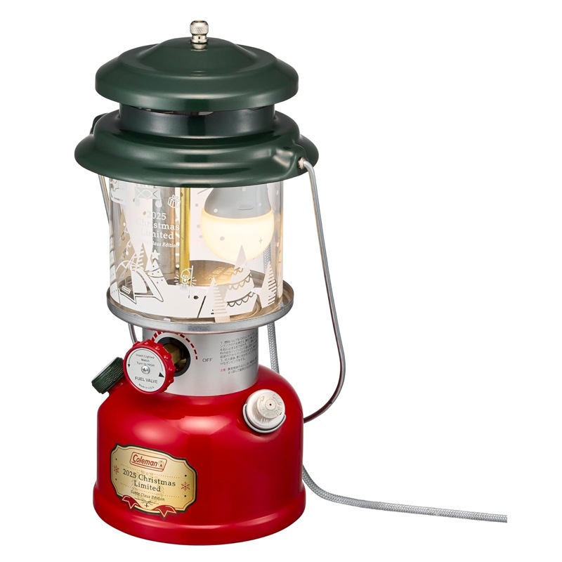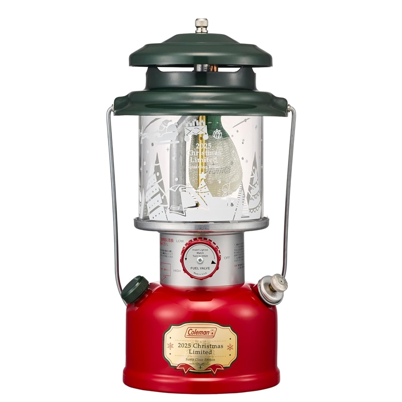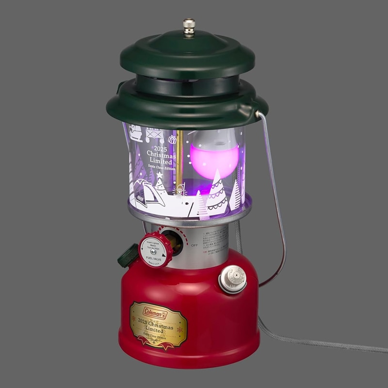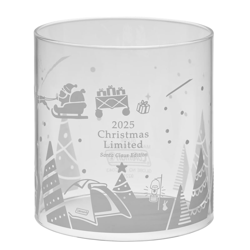 冬のキャンプ場の空を駆けるサンタクロースの姿が描かれたグローブとクリスマス限定のタンクタグ